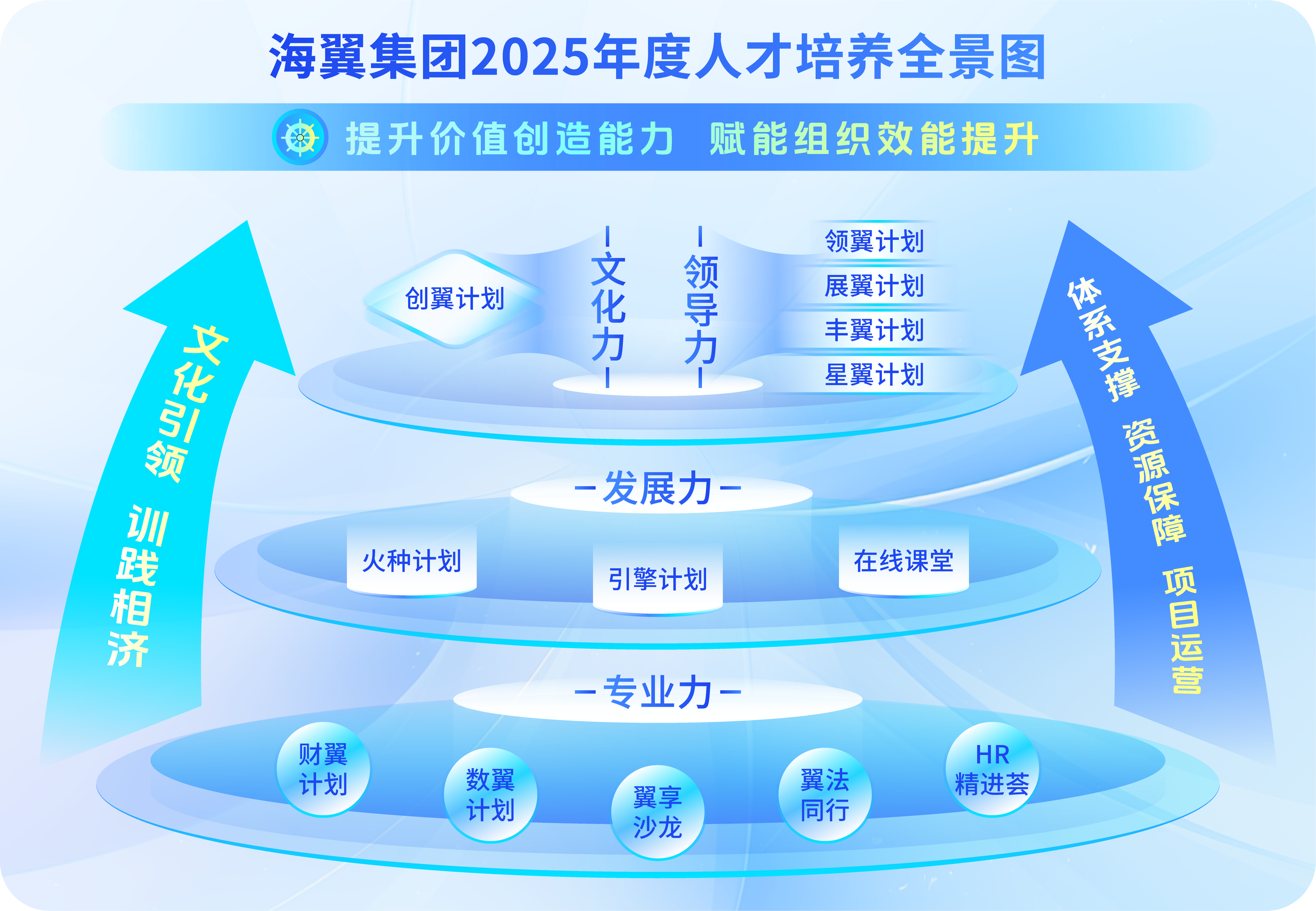 2025年海翼集團人才培養(yǎng)緊扣“強鏈拓圈,向新求質”主題,以“提升價值創(chuàng)造能力,賦能組織效能提升”為使命,以“文化引領、訓踐相濟”理念為指導,以“體系支撐、資源保障、項目運營”為支柱,厚植“文化力”、鍛造“領導力”、夯實“發(fā)展力”、提升“專業(yè)力”,構建“四力聚能”培訓體系,培育“文化認同、領導卓越、專業(yè)過硬”的優(yōu)秀人才隊伍。
